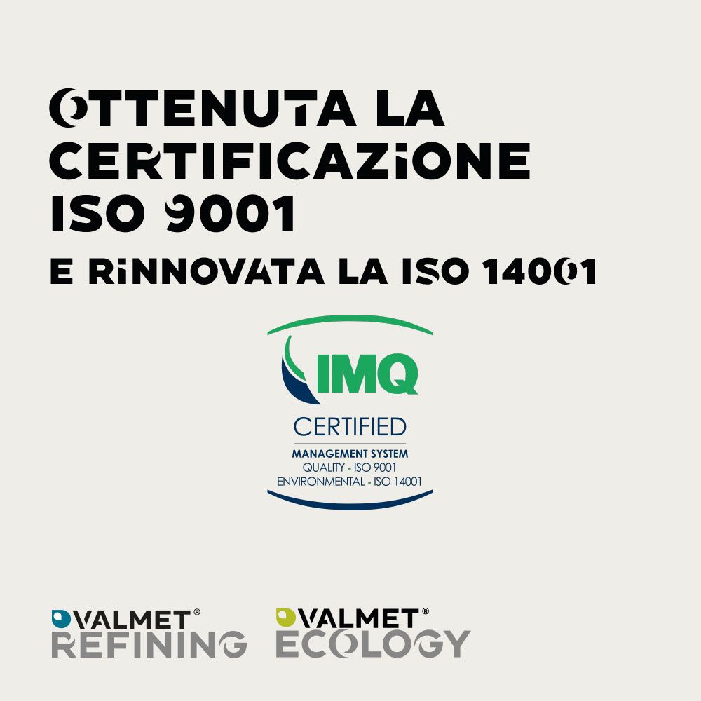 Valmet S.r.l ottiene la certificazione ISO 9001 e il rinnovo della ISO 14001